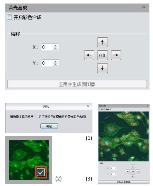 在生物科學(xué)領(lǐng)域,常常用不同的熒光染料標(biāo)定不同的細(xì)胞結(jié)構(gòu),在熒光顯微鏡下只能看到一種熒光圖像。熒光合成功能可幫助用戶將同一視野下的多張熒光圖像合成為一張,從而獲得一張完整的彩色圖像。