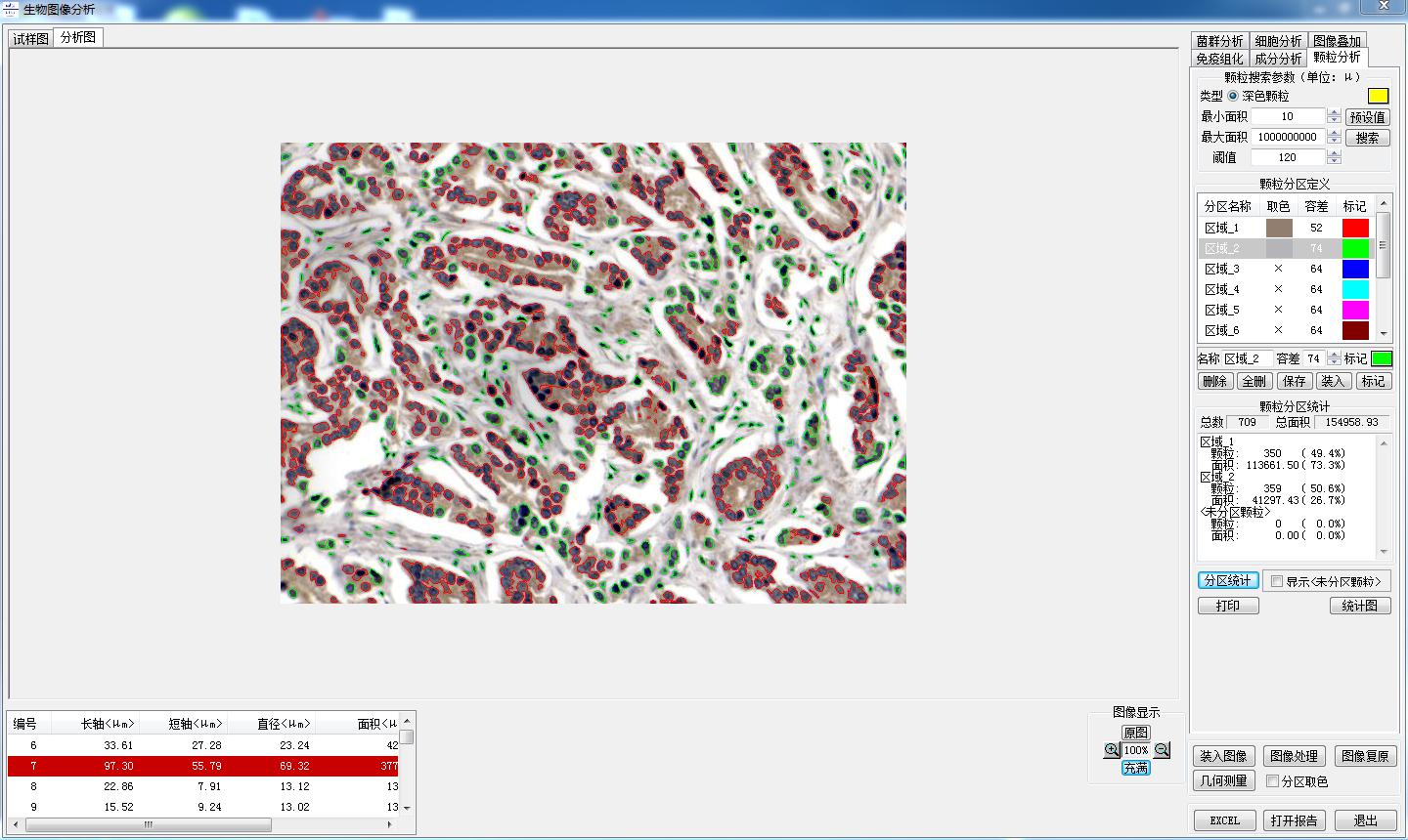 5、顆粒分析:軟件自動(dòng)提取顆粒,并可設(shè)置區(qū)域,得出每個(gè)區(qū)域的顆粒數(shù),面積及百分比。