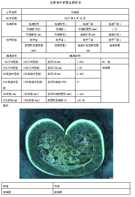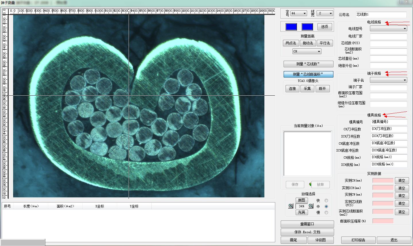 本軟件可測(cè)量端子芯線數(shù);壓接高度;壓接寬度;壓接角度;支承高度;尖端間距;毛刺高度;毛刺寬度;基體厚度;芯線斷面積;斷面積壓縮比率。
