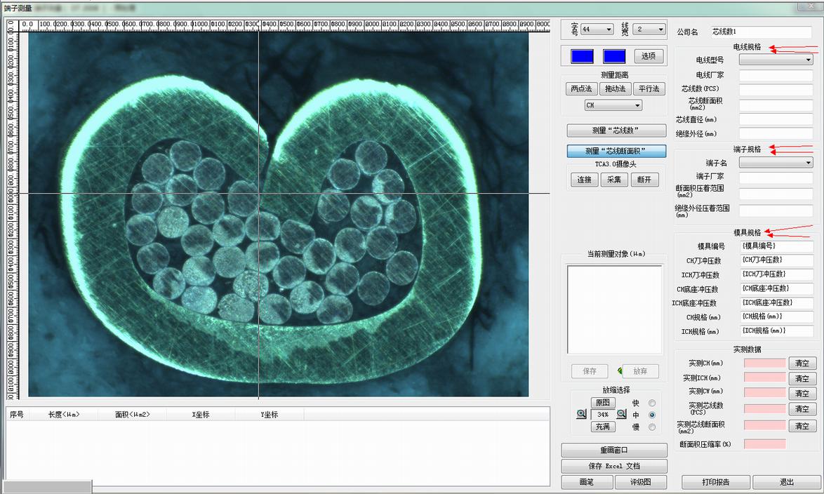 1、端子斷面測量分析功能:本軟件可測量端子芯線數(shù);壓接高度;壓接寬度;壓接角度;支承高度;尖端間距;毛刺高度;毛刺寬度;基體厚度;芯線斷面積;斷面積壓縮比率。